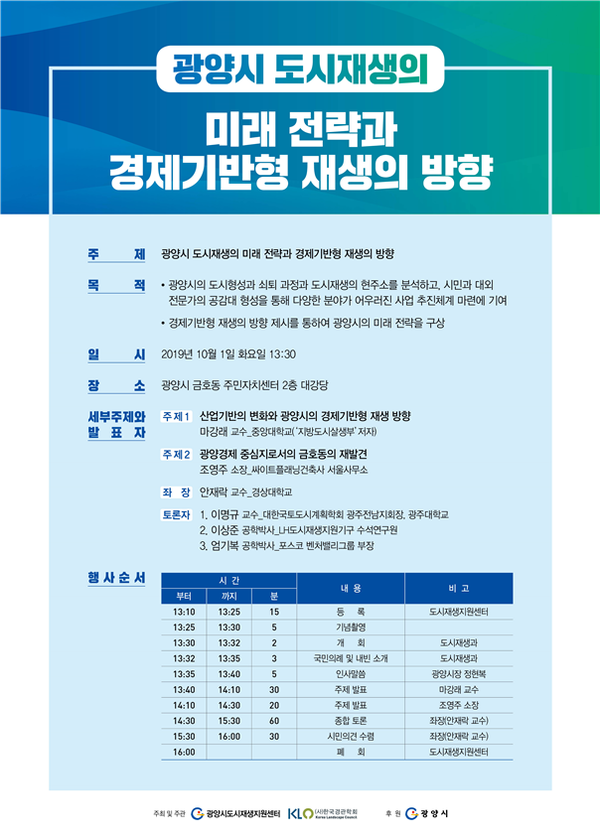 이번 심포지엄은 ‘광양시 도시재생의 미래전략과 경제기반형 재생의 방향’을 주제로 열리며,