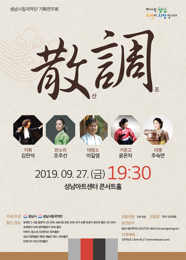 성남시립국악단은 돌아오는 9월 27일 (금) 19:30 성남아트센터 콘서트홀에서 기획연주회 ‘산조’를 공연한다.