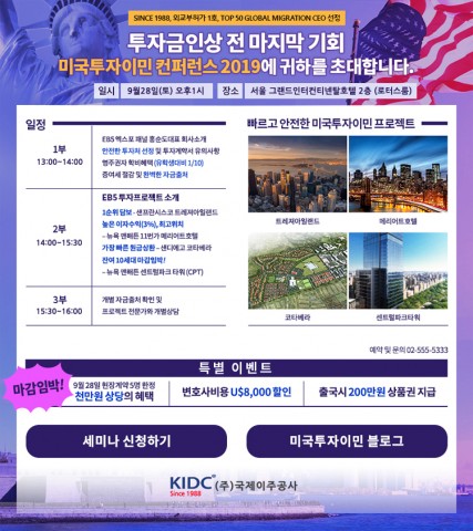 미국투자이민비용 인상이 확정되자, 미국투자이민을 신청하려는 수요자들의 관심이 집중되고 있다. 이에 국제이주공사는 28일 삼성역 그랜드 인터콘티넨탈 호텔에서 미국투자이민(EB-5) 설명회를 개최한다.