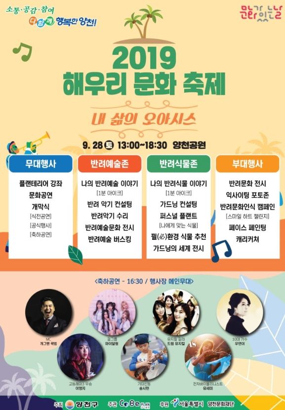 김수영 양천구청장은 “이번 해우리 문화축제에 반려문화에 관심 있는 많은 구 민들이 참여해 다양한 반려 문화를 직접 체험하고, 공감하며 내 삶의 오아시스를 찾아가는 시간이 되시기를 바란다.”고 말했다.