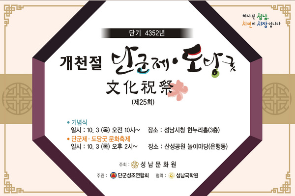 성남문화원(원장/김대진)은 단기 4352년 개천절 기념식 및 단군제 및 도당굿 문화축제(제25회)를, 오는 10월 3일 오전 10시부터 성남시청 한누리 홀에서 개천절 기념식을, 오후 2시부터 은행동 산성 공원 놀이마당에서 단군제 · 도당굿 문화축제를 개최한다.