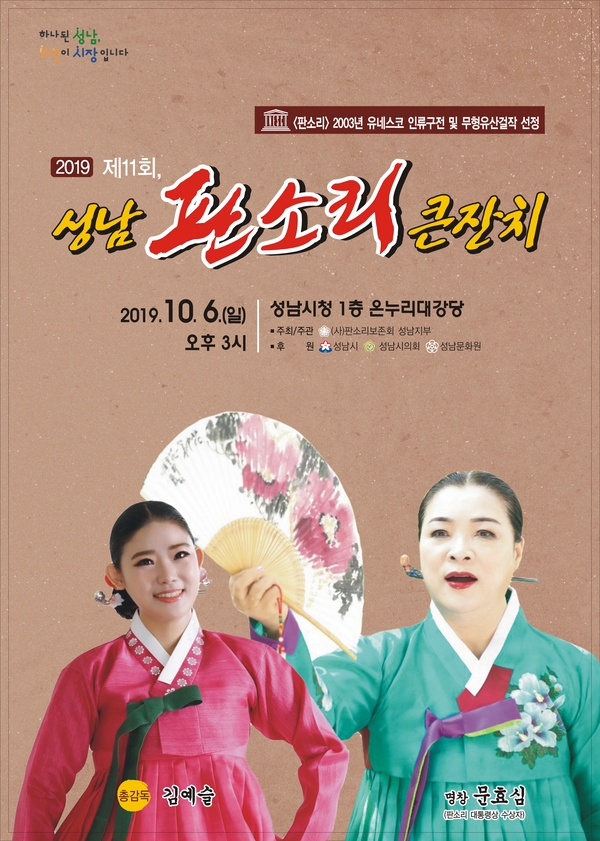(사)한국판소리보존회 성남시지부(지부장 문효심) 주최, 성남문화원이 후원하는, 제11회 ‘성남 판소리 큰잔치’ 공연이 10. 6(일) 오후 3시, 성남시청 1층 온누리 대강당에서 무료 공연으로 개최된다.