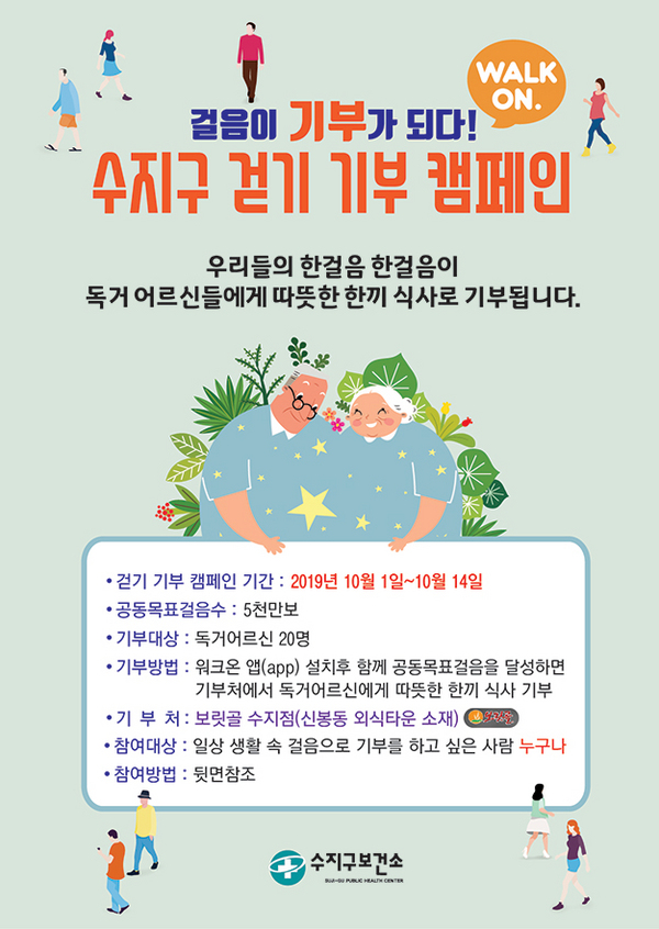 용인시 수지구보건소는 만보기 기능의 걷기 앱 워크온을 활용해 걸으면서 나눔을 실천하는 기부 캠페인을 10월 1일부터 14일까지 진행한다고 밝혔다.