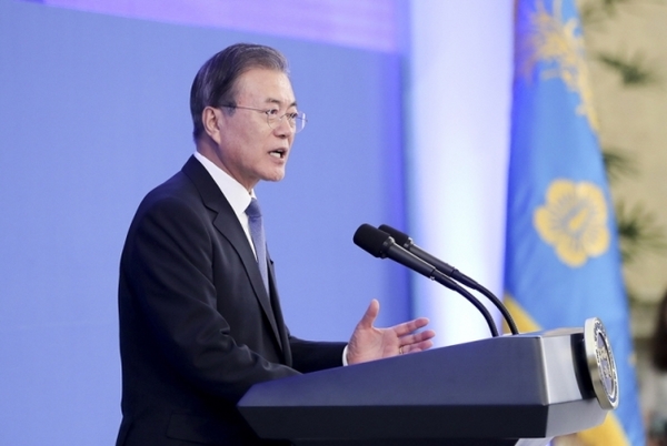 ▲문재인 대통령이 지난달 30일 청와대에서 열린 민주평통 자문회의 출범식에서 기념사를 하고 있다. 사진=청와대