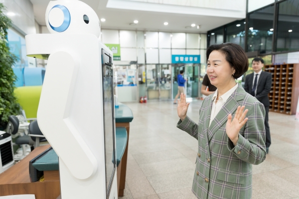 구청 1층에서 파워봇 시연중인 김수영 구청장
