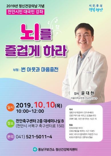 정신건강 시민강좌는 다수 방송 출연 경험을 보유한 윤대현 서울대학병원 강남센터 정신건강의학과 전문의가 ‘뇌를 즐겁게 하라 - 번아웃과 마음충전’을 주제로 시민의 행복지수를 더욱 높인다.