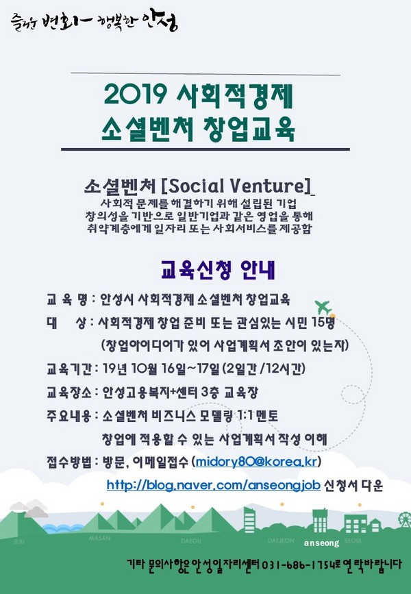 안성시 일자리센터는 오는 16일부터 17일까지 안성고용복지 센터에서 사회적경제 소셜벤처 창업교육을 진행한다. 소셜벤처는 사회적인 문제를 해결하기 위해 설립된 사회적 기업을 의미하며 창의성과 도전정신을 기반으로 일반기업과 같은 영업을 통해 취약계층에게 일자리 및 사회서비스를 제공한다. 이번 창업교육은 사회적경제 창업에 관심 있는 시민을 대상으로 사회적경제 소셜벤처 비즈니스 모델링 정립과 사업계획서 작성법 등 창업에 필요한 실질적인 방법을 교육한다. 시 관계자는 이번 교육을 통해 사회적경제를 이해하고 뜻을 같이하는 사회친화적 계층을 형성하여 사회적경제 조직 네트워크 확대를 위한 기초가 마련될 것으로 기대한다고 전했다. 교육신청방법은 안성고용복지 센터를 방문하거나 이메일(midory80@korea.kr)로 신청하면 되고, 자세한 문의사항은 안성시청 창조경제과(686-1754)로 하면 된다. 한편 안성시는 상반기에는 사회적경제 창업아카데미 를 통해서 창업통합교육을 실시하였으며 이와 연계하여 소셜벤처 창업교육을 진행하고 안성시 내 사회적경제 기업가 발굴 및 경영능력 제고 등을 지원하고 있다.