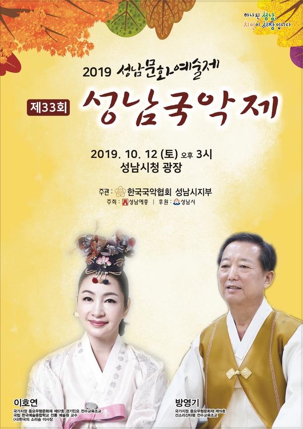 성남 국악인들의 한마당 큰잔치인 ‘제33회 성남국악제’가 10. 12(토) 오후 3시 성남시청 앞 광장에서, 신명 나는 우리 가락과 흥겨운 우리 소리의 국악 축제로 열린다.