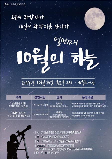 애월도서관(탐라도서관장 고광석)에서는 청소년들에게 과학에 대한 관심을 불러일으키고 장차 미래의 과학자로 성장할 수 있는 기회를 제공하고자 ‘10월의 하늘(과학자들의 작은 도시 강연)’을 운영한다.
