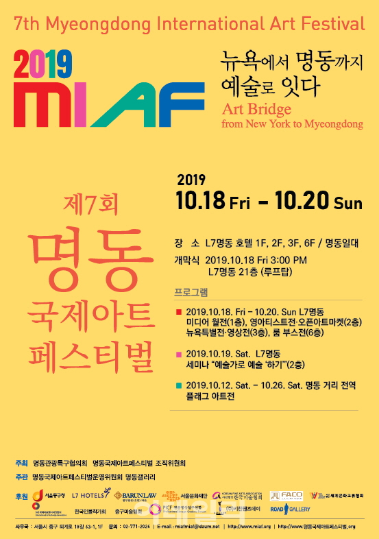 ‘제7회 명동국제아트페스티벌’(MIAF 2019)이 오는 26일까지 서울 중구 L7명동과 명동 일대에서 열린다. 본 행사는 명동국제아트페스티벌조직위원회가 명동관광특구협의회와 공동주최하고 명동갤러리와 공동주관하며 L7명동이 후원한다.