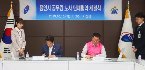 용인시는 15일 시청 시장실에서 용인시공무원노동조합과 최초의 노사 단체협약을 맺었다.