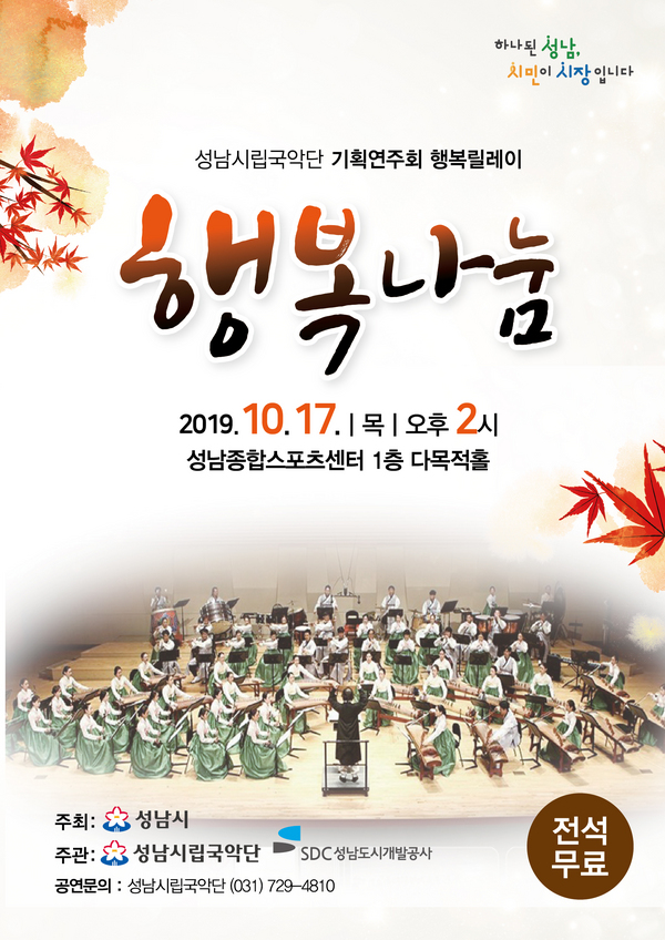 성남시민의 공공 문화 체육시설 등 복합 문화 공간인 성남종합운동장 內 성남 종합스포츠센터 1층 다목적 홀에서 특별 무대로 2019년 10월 17일 오후 2시 성남시립국악단 감독 겸 상임 지휘자 김만석 지휘로 연주회를 성남 도시개발공사와 함께 개최한다.