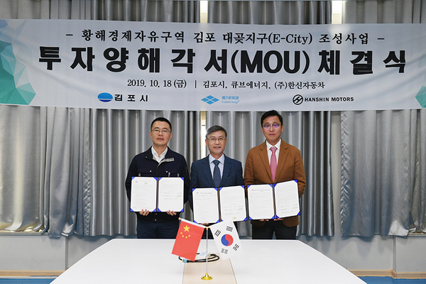 김포시는 지난 18일 중국 산둥성 내 랴오청시에서 ‘황해경제자유구역 김포 대곶지구(E-City)’ 투자유치를 위한 전기차 관련기업 ㈜한신자동차, 중통버스, KYC오토, CJ 대한통운, 큐브에너지와 양해각서를 체결했다고 밝혔다.