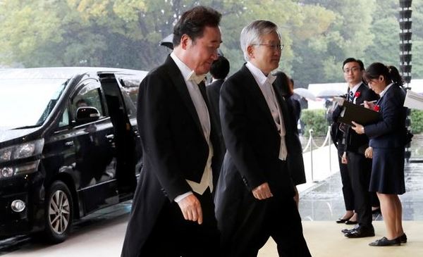 이낙연 국무총리가 22일 도쿄 고쿄(皇居)에서 열리는 나루히토 일왕 즉위 의식에 참석하기 위해 황궁에 도착해 의전 받고 있다. 2019.10.22.