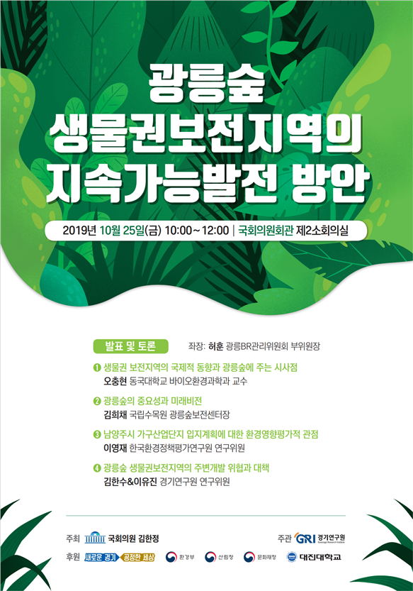 발표는 오충현 동국대학교 교수의 ‘생물권 보전지역의 국제적 동향과 광릉숲에 주는 시사점’, 김희채 국립수목원 센터장의 ‘광릉숲의 중요성과 미래 비전’, 이영재 한국환경정책평가연구원 연구위원의 ‘남양주시 가구산업단지 입지계획에 대한 환경 영향 평가적 관점’, 김한수·이유진 경기연구원 연구위원의 ‘광릉숲 생물권보전지역의 주변 개발 위협과 대책’으로 구성된다.
