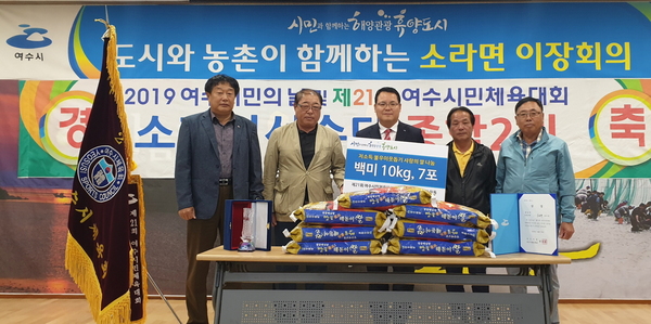 ▲ 지난 23일 여수시 소라면 윷놀이 선수단이 저소득 가정을 위해 써달라며 소라면사무소에 백미 7포를 후원했다. 이날 후원품은 지난 15일 열린 시민체육대회 입상 상품으로 마련됐다. 윷놀이 선수대표 김규협 씨는 “작지만 지역 주민에게 도움을 줄 수 있어 기쁘다”고 말했다.