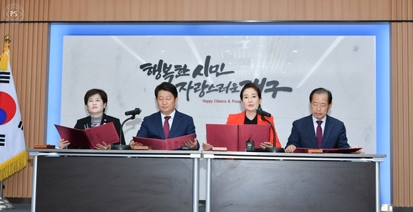 ▲대구광역시, 대구광역시교육청, 대구시의회, 구・군이 무상급식 단계적 실시 협의문 작성모습 ⓒ대구시