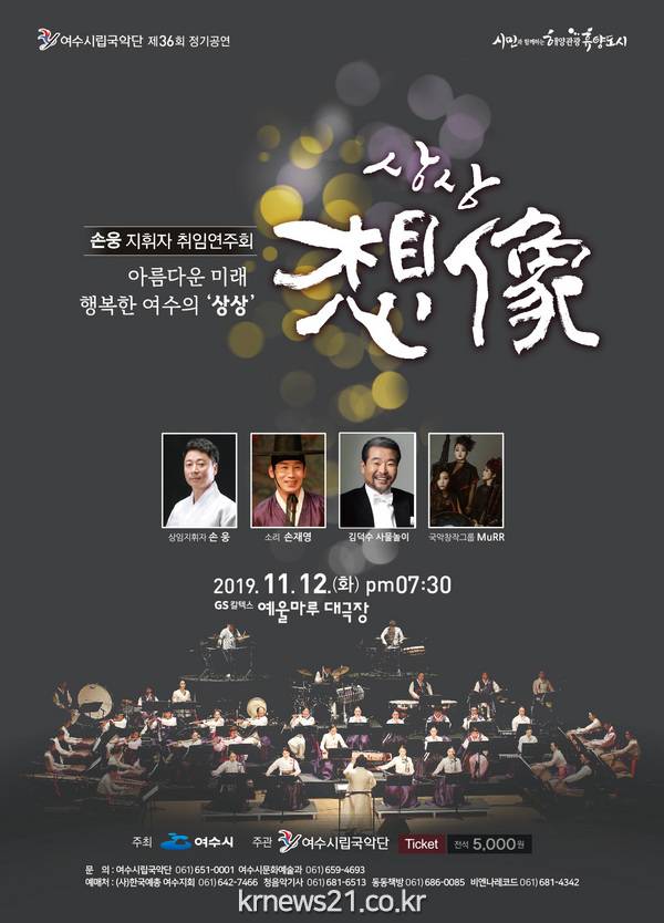 ‘아름다운 미래 행복한 여수의 상상(想像)’이라는 주제로 열리는 이번 연주회에는 여수시립국악단 단원 41명과 김덕수 사물놀이팀 등 객원 34명이 출연한다.