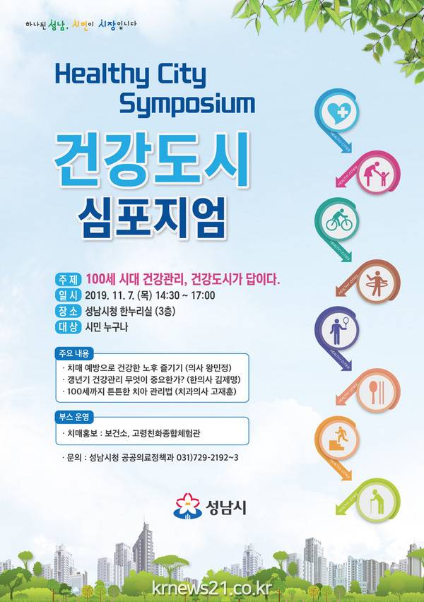성남시(시장 은수미)는 오는 11월 7일 오후 3시~5시 시청 한누리에서 ‘100세 시대 건강관리, 건강도시가 답이다’를 주제로 한 심포지엄을 연다.