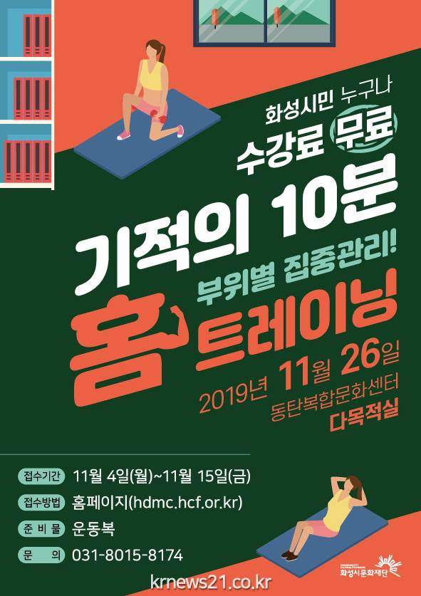 (재)화성시 문화재단(대표이사 최형오) 동탄 복합문화센터는 11월 26일 시민들을 대상으로 무료 건강 특강 프로그램 ‘홈 트레이닝’을 진행한다고 전했다.