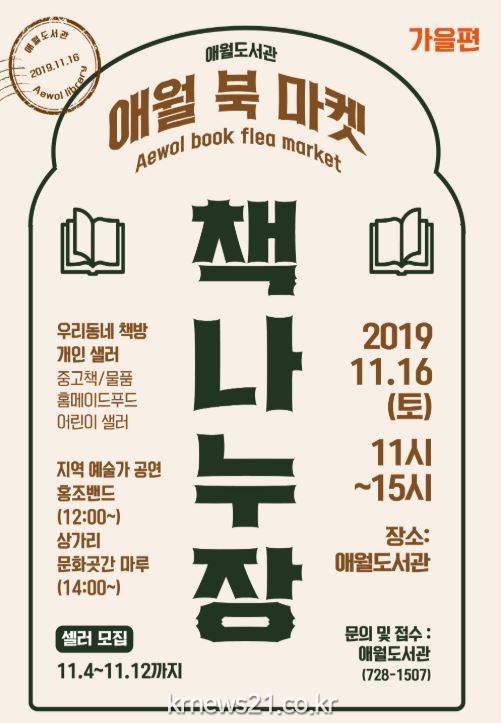 애월도서관(탐라도서관장 고광석)에서는 책을 매개로 소통과 나눔의 장 마련을 위한 북-플리마켓 ‘책 나누장’을 운영하며 행사에 함께 할 샐러를 11월 4일(월)부터 12일(화)까지 모집한다.