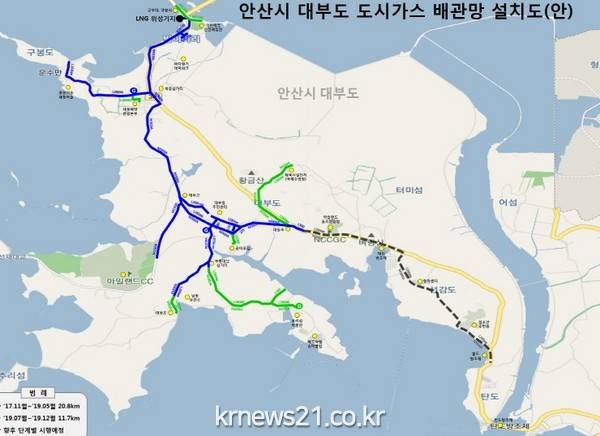 시는 이어 2022년까지 단계별로 도시가스 공급 관을 추가 설치해 도시가스 공급지역을 확대한다는 구상이다. 현재 다음 달 준공 목표로 50억 원이 투입돼 유리섬 박물관, 대부도 복지 체육센터(2020년 준공예정) 등으로 이어지는 11.7㎞ 구간의 공급 관이 설치 중이며, 내년에는 12.4㎞, 2021년에는 5.6㎞, 2022년에는 7.4㎞ 등 모두 57.9㎞ 구간으로 확대될 계획이다.