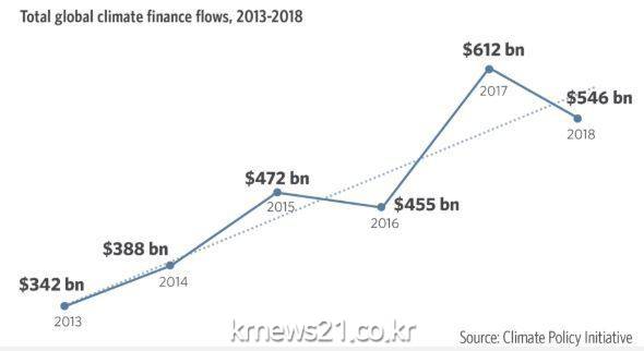 비정부기구(NGO) 기후정책이니셔티브(CPI)는 7일(현지시간) 홈페이지를 통해 발표한 '2019 기후 재정의 글로벌 지형'이란 제목의 보고서에서 지난해 전 세계에서 온실가스 배출을 줄이기 위해 투자한 액수가 총 5460억 달러(약 633조원)를 기록해, 전년 6120억 달러 보다 11% 감소했다고 밝혔다.