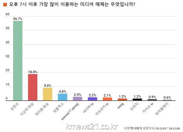 ‘오후 7시 이후 가장 많이 이용하는 미디어 매체는 무엇입니까?’에 대하여 질문한 결과 ‘유튜브(56.7%)’가 많은 응답을 차지하였고, ‘지상파 방송(18.8%)’, ‘케이블 방송(9.0%)’, ‘넷플릭스(4.8%)’, ‘Wavve(구 pooq) (2.5%)’, ‘네이버TV(2.2%)’, ‘아프리카TV(2.1%)’, ‘TVing(1.2%)’, ‘트위치(1.2%)’, ‘카카오TV(0.9%)’, ‘왓챠플레이(0.6%)’순으로 나타났다.