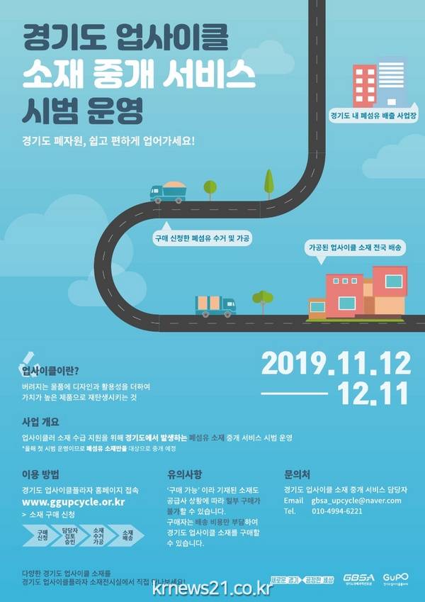 경기도와 경기도경제과학진흥원(이하 경과원)이 운영하는 경기도 업사이클 플라자가 ‘2019년 경기도 업사이클 소재 중개 서비스’를 오는 12월 11일까지 시범적으로 운영한다.