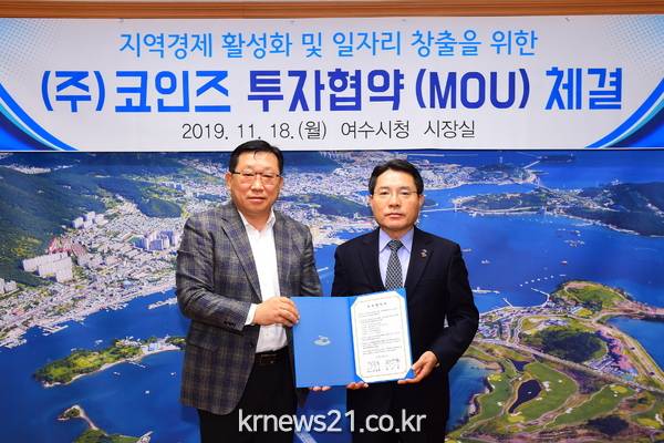 여수시(시장 권오봉)와 (주)코인즈(대표이사 최명환)가 18일 시청 시장실에서 70억 규모의 공장 증설 투자협약을 체결했다.