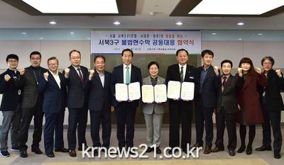 협약에 따라 이들 3개 구는 ▲불법현수막 정비에 관한 정보 공유 ▲합동단속을 위한 인적 물적 교류 ▲과태료부과, 고발 등의 행정처분 ▲기타 현안 해결 등을 위해 상호 협력한다.
