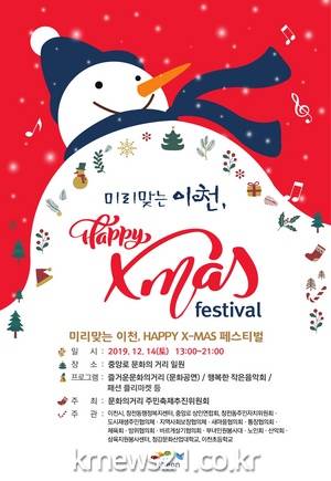 문화의 거리 주민 축제추진위원회가 주최하고 주민협의체 및 유관단체가 주관하는 ‘미리 맞는 이천, HAPPY X-Mas 페스티벌’는 오후1시부터 오후 9시까지 중앙로 문화의 거리 내에서 열린다.