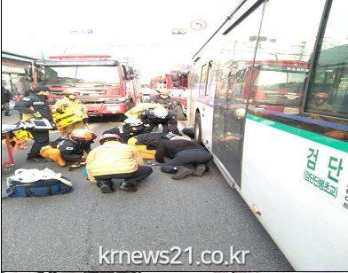 이날 지령을 받고 출동한 김포소방서 구조대, 중앙119안전센터, 구급대 소방관들은 현장 도착 즉시 에어백과 유압전개기를 사용하여 버스 우측 뒷바퀴에 다리가 깔려 있는 시민(여/85)을 안전하게 구조해 응급처치 후 일산 백병원으로 이송하였다.