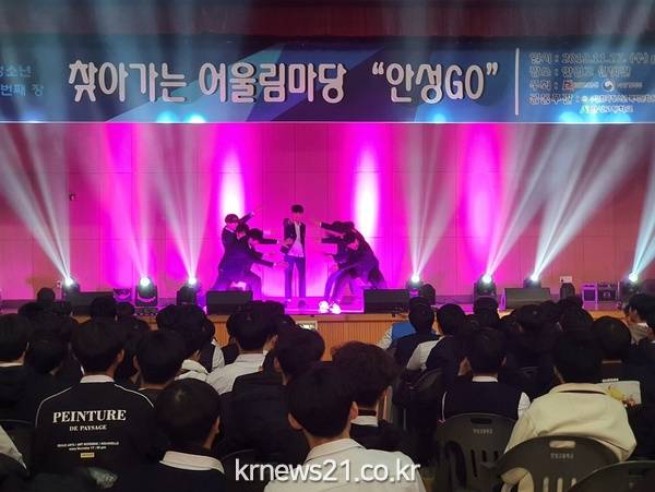 ‘공감・성장・도전으로 꿈을 키워가는 행복한 안성고’라는 학교 비전 아래 안성 명문고로 발돋움하고 있는 안성고등학교 학생 500여 명이 모인 가운데 펼쳐진 찾아가는 청소년 어울림마당 ‘안성 GO’는 청소년들의 문화적 감수성 증진 및 공유를 통해 학생들과 교직원 간 화합의 장 조성을 위해 공연프로그램으로 꾸며졌다.