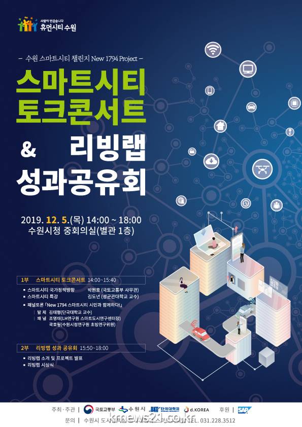 수원시는 12월 5일 오후 2시 시청 중회의실에서 ‘스마트시티 토크 콘서트·리빙랩(Living Lab) 성과 공유회’를 연다.
