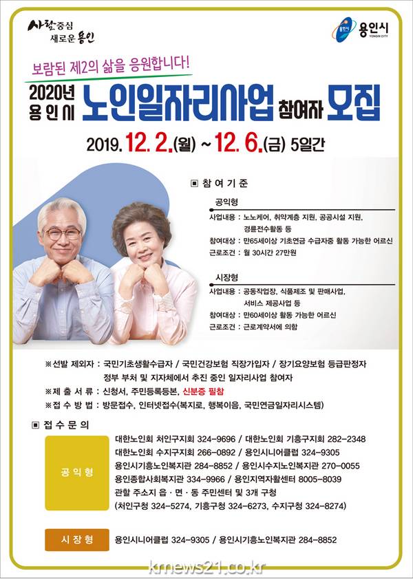 용인시는 내년 관내 12개 기관의 노인 일자리 사업에 참여할 3730명의 어르신을 모집한다.