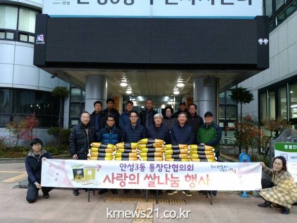 안성시 안성3동 통장단협의회는 지난 3일 지역의 어려운 이웃들을 위해 8년째 이어온 사랑의 쌀 나눔 행사를 실시했다. 이날 행사는 안성3동 통장들이 십시일반으로 모은 기금으로 10㎏ 쌀 21포대를 구입하여 마을의 홀로 어르신 생활이 어려운 다자녀 가구 등에 전달됐다. 유승돈 협의회장은 어느덧 사랑의 쌀 나눔 행사가 8년째가 되었다며 항상 동참해 주는 통장들께 감사하며 앞으로도 주변의 어려운 이웃들을 돕기 위해 노력하겠다고 밝혔다. 이에 박종철 안성3동장은 항상 어려운 이웃을 위해 먼저 발 벗고 나서 주셔서 감사드린다며 통장단협의회의 따뜻한 마음이 안성3동 전역에 퍼져 나가길 바란다고 말했다.