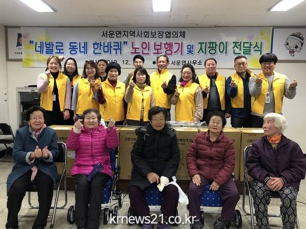 안성시 서운면 지역사회보장협의체 공동위원장 김진환 나인숙 는 지난 3일 관내 취약계층 어르신 12명에게 노인보행기 및 지팡이를 전달했다. 서운면 지역사회보장협의체의 우리동네 특화사업 일환인 네발로 동네한바퀴 는 거동이 불편한 저소득 어르신들에게 보행기 및 지팡이를 지원하여 동네 외출과 거동을 돕는 사업이다. 이날 보행기를 지원 받은 한OO어르신(79세)은 그동안 무릎관절이 좋지 않아 걷고 움직일 때 마다 고통스러워 외출을 하지 못했는데 보행기에 의지해서 걸으니 한결 편하다며 감사의 뜻을 전했다. 나인숙 위원장은 저희 협의체에서는 전수조사를 통하여 복지의 사각지대에 있는 소외계층 찾아내어 건강물품지원 및 동절기 유류쿠폰 지급 등 많은 사업을 진행했다면서 지속적으로 협의체 위원들과 투철한 봉사정신을 발휘할 것 이라고 전했다. 이에 김진환 서운면장은 지역 내 복지사각지대를 위해 애쓰시는 협의체 여러분의 따뜻한 마음과 열정에 큰 감동을 받았다면서 앞으로 복지사각지대 없는 서운면을 만들기 위해 민·관이 하나 될 수 있도록 노력하겠다고 말했다.