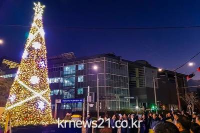 ▲ [사진제공 = 광진구]광진구(구청장 김선갑) 광장동(동장 홍선옥)과 장로회신학대학교가 4일 광장동 시립광진청소년센터 앞 교통섬에 대형 크리스마스 트리를 설치하고 점등식을 가졌다.