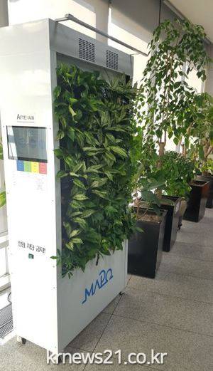 마포구(구청장 유동균)는 공기정화식물을 통한 자연 공기정화와 사물인터넷 기술(IoT)을 활용한 공기청정기를 접목한 ‘식물 실내공기정화기 1호’를 마포구청 로비에 설치했다고 밝혔다.
