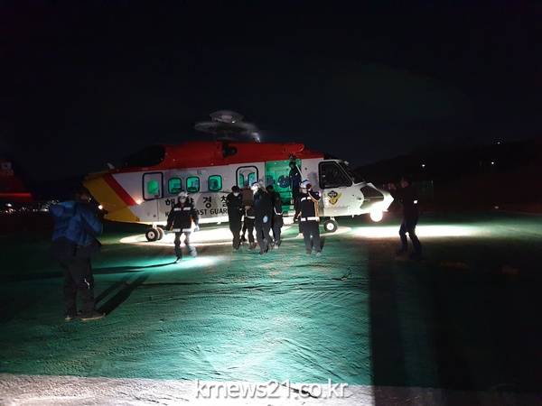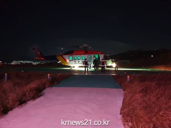 요청에 따라 즉시 서해지방청 헬기를 이용 응급환자와 보호자를 탑승 신속하게 이송하여,