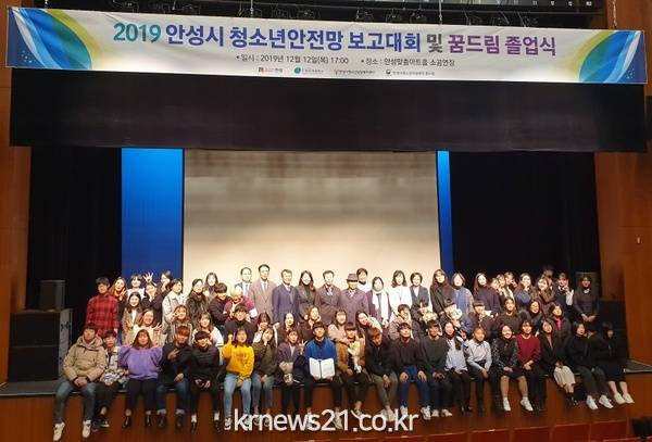 안성시청소년상담복지센터는 지난 12일 안성맞춤아트홀 소공연장에서 안성시청 관계자를 비롯해 청소년안전망 위원 1388청소년지원단 청소년 등 120여명이 참석한 가운데 2019 안성시 청소년안전망 보고대회 및 꿈드림 졸업식을 개최했다. 이날 행사는 박상호 행정복지국장 축사를 시작으로 신원주 안성시의회의장, 홍종우 두원공과대학교 산학협력단장 격려사 김학용 국회의원 축전으로 이어졌으며 안성시학교밖청소년지원센터 꿈드림 졸업식 및 수료증 수여 관련 청소년 시상 우수지원단 감사패 청소년안전망 사업보고 순으로 진행됐다. 특히 이번 행사는 안성시 꿈드림 청소년들이 바리스타 제과제빵 프로그램으로 배운 기술로 직접 다과를 준비하였고 음악동아리 클라시쿠스 의 졸업 공연 수화동아리 목(目)소리의 수화공연, 멘토링 프로그램 리딩클럽 의 시 낭송까지 진행되면서 다채롭고 의미 있는 시간을 가졌다. 장은정 센터장은 2019년 안성시 청소년안전망을 중심으로 위기청소년을 돕는 일에 힘써주셔서 감사하다며 꿈드림 청소년들의 졸업과 수료를 축하하며 앞으로도 안성시 청소년들의 건강한 성장을 돕기 위해 함께 힘을 모아주길 바란다고 말했다. 한편 안성시청소년상담복지센터는 지난 1999년 개소하여 올해 20주년을 맞았으며 위기청소년을 돕는 청소년안전망의 허브기관으로 부모교육 학교폭력예방교육 자살예방교육, 성교육프로그램 청소년특별지원사업 1388청소년지원단(법률 상담 자활 복지 보호 멘토지원단 등)을 운영하며 위기청소년들의 건강한 성장을 지원하고 있다.