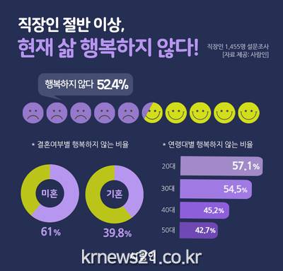 ▲ [자료제공 = 사람인]대한민국 직장인의 절반 이상이 현재 삶이 행복하지 않다고 느끼는 것으로 조사됐다.