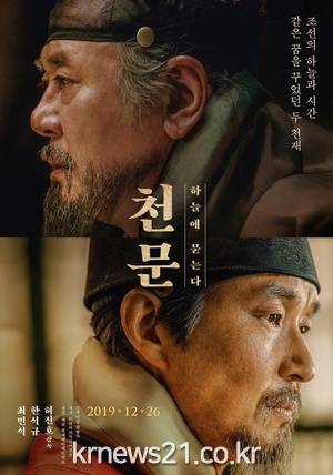 ▲ [영화 `천문` 포스터/영화진흥위원회]‘천문: 하늘에 묻는다’(이하 ‘천문’)는 조선시대 가장 위대한 왕으로 꼽히는 세종(한석규)와 관노 출신 천재 과학자 장영실(최민식)의 이야기를 그린 팩션(Faction-역사적 사실에 상상력을 덧붙인 이야기) 사극 영화다.