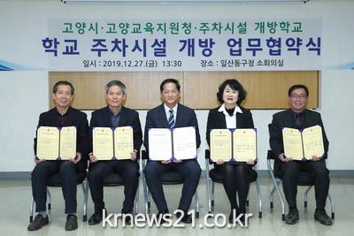 ▲ [사진제공 = 고양시]고양시는 지난 12월 27일 일산동구청에서 고양교육지원청 및 주차시설 개방학교(원당초, 용정초, 저동고)와 ‘학교 주차시설 개방 업무협약’을 체결했다. 이로써 주차난에 힘겨워했던 주민들의 숨통이 트일 전망이다.