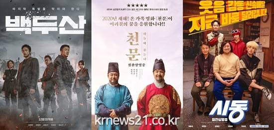 ▲ [백두산/천문/시동 영화포스터]새해 첫 박스오피스 1위는 영화 '백두산'(감독 이해준 김병서)이 차지했다.