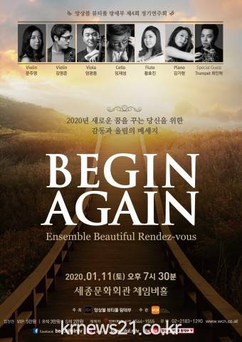 바이올리니스트 문주영과 김영준, 비올리스트 엄광용, 첼리트스 임재성, 플루티스트 황효진, 음악감독이자 피아니스트 김가람으로 이루어진 앙상블 뷰티풀 랑데부는 2020년 한해를 시작하며 새롭게 시작하는 모든 분들에게 희망차고 따뜻한 음악으로 무대를 꾸밀 예정이다.