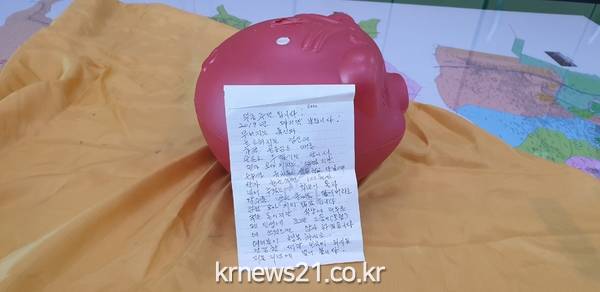 만덕동에 따르면, 돼지저금통에는 ‘손자가 유치원 다닐 때부터 시작해 9년 동안 동전을 모았다’면서 ‘적은 돈이지만 어려운 이웃에게 보탬이 됐으면 한다’는 쪽지가 붙어 있었다.