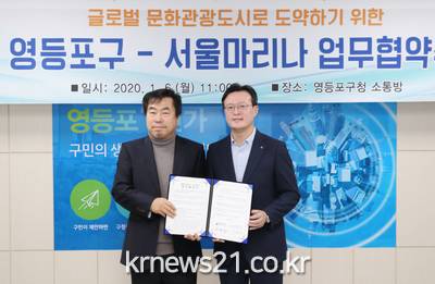 구는 글로벌 문화관광 도시로의 성장과 주민의 문화적 감수성을 증진하고자, 채현일 영등포구청장과 서울마리나 임탁기 대표가 지난 6일 구청 소통방에서 협약을 체결했다.