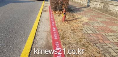 ▲ [사진제공 = 김포시]김포시(시장 정하영)가 유사 시 신속한 소방활동 지원을 위해 100개소의 소방시설 주변 경계석과 가장자리에 적색표시 공사를 완료했다.